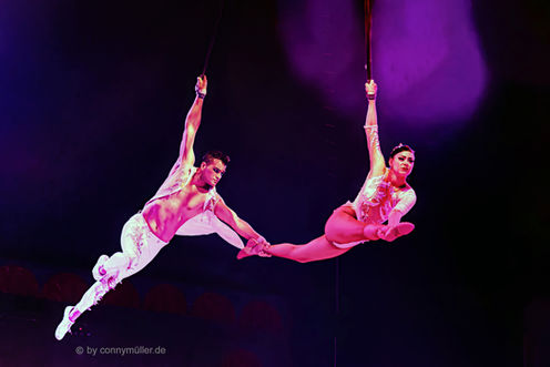 Vom Gelsenkirchener Weihnachtscircus bekannt ist das Akrobatikduo „Avant Ta Peau“. Mit ihrer Love Story hoch oben unter der Zirkuskuppel und einer mitreißenden Hula-Hoop-Kür runden sie das Programm der Circus Sessions im Revier ab.